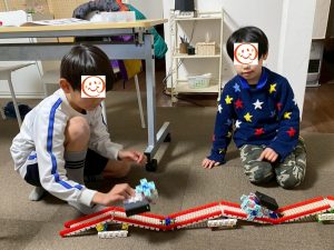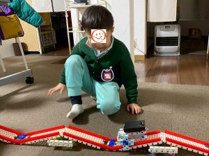 完成後は、各自が工夫して作った線路をつなぎ、みんなで大きなコースを作りました。途中で引っかからないように高さを調整したり、角度を工夫したりと、自然と改良が始まります。うまくいかなければ直す。その繰り返しの中で、考える力と粘り強さが育っていきます。